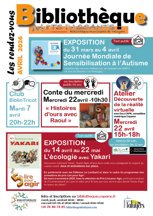 Une exposition autour de la Journée mondiale de sensibilisation à l’autisme, mettant en lumière les œuvres des résidents de l’IMPro Le clos de Sésame.Les rendez-vous se poursuivent avec le convivial Biblio Tricot,